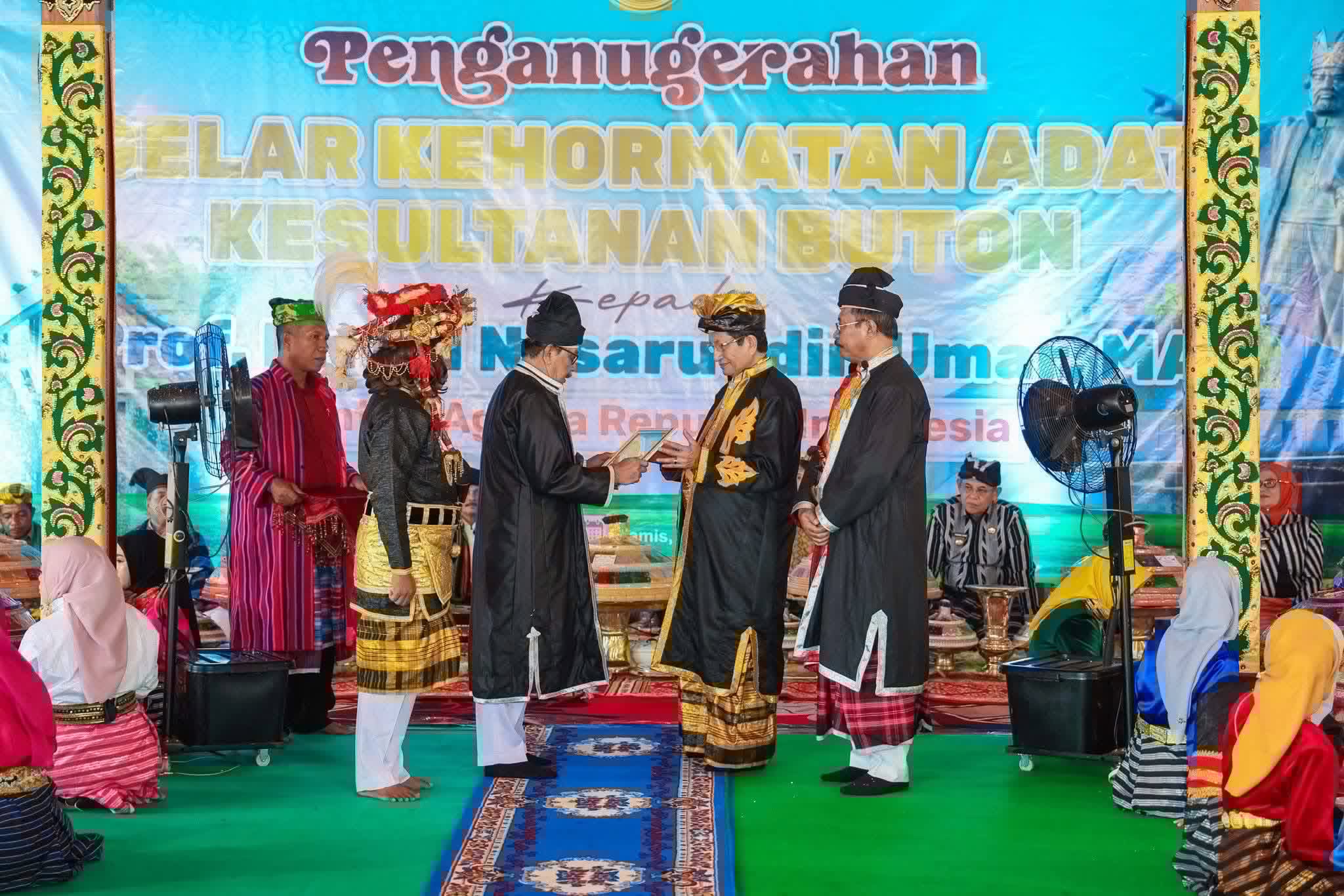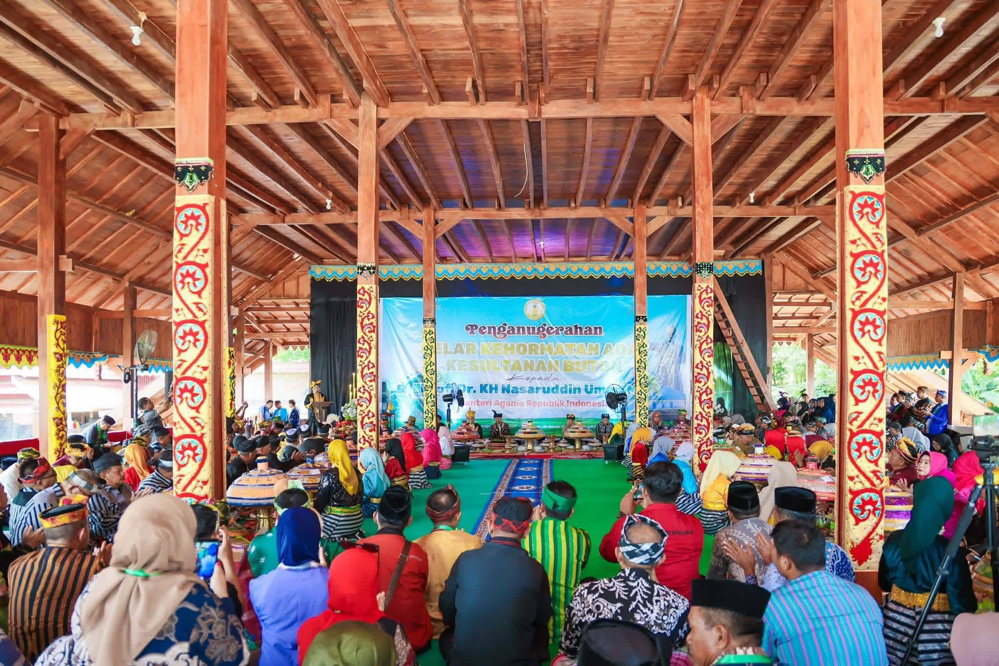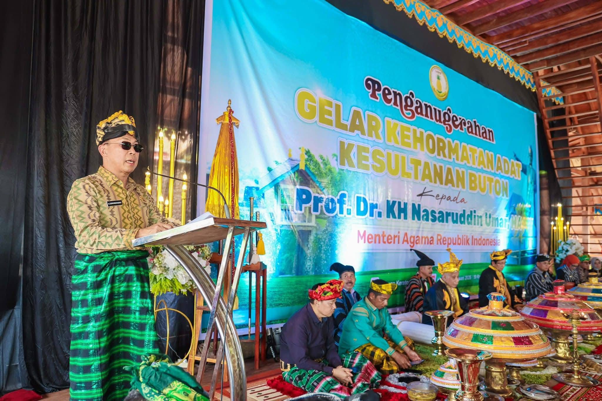 Baubau-SULTRAICON.COM || Menteri Agama Republik Indonesia, Prof. Dr. KH. Nasaruddin Umar, MA, menerima gelar kehormatan adat “Mia Ogena I Sara Agama” dari Kesultanan Buton dalam prosesi adat yang berlangsung di Baruga Keraton, Kota Baubau pada Kamis (8/1/2026).